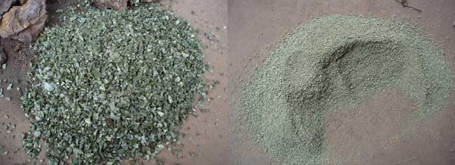 以上图片中,颜色大多为青绿色,左图的渣粒度较大,右图的渣粒度较小,由此即可断定左方为硅锰冶炼渣干渣,右图为硅锰冶炼渣水渣。